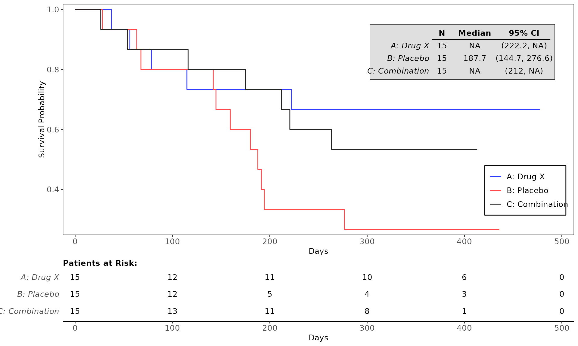 #>                                                                A: Drug X    B: Placebo   C: Combination