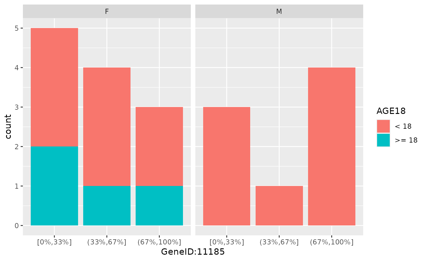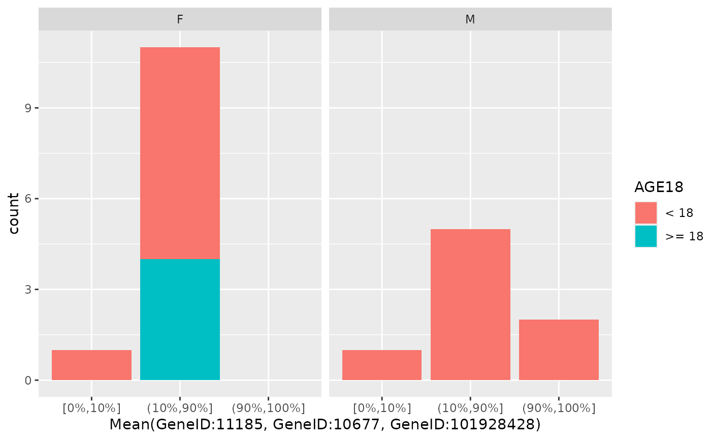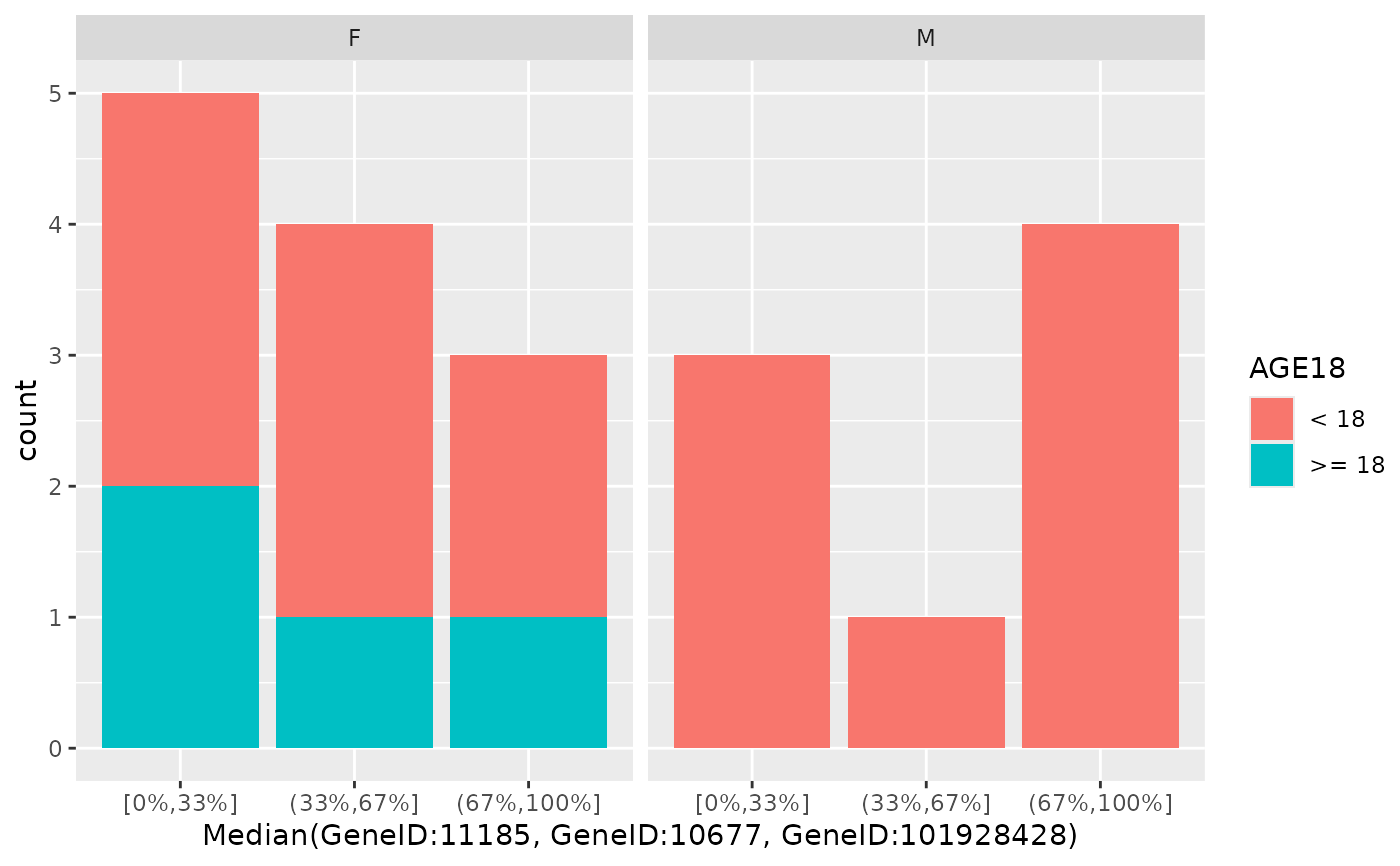 This produces a barplot of the dichotomized gene expression counts into two or three categories based on custom defined percentiles.