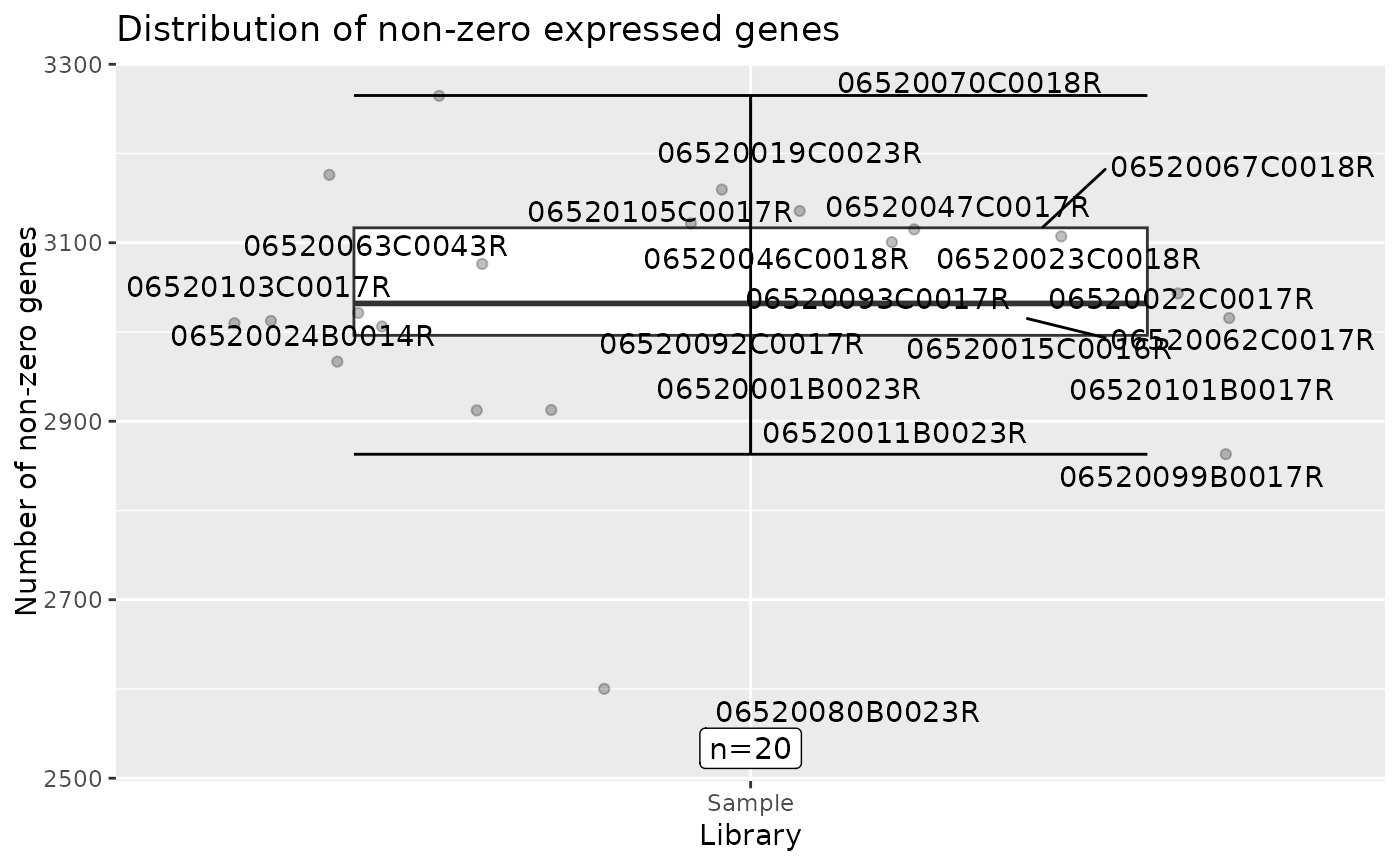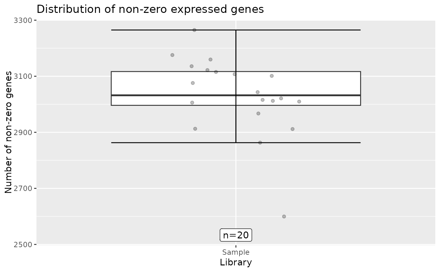 This draws a boxplot, with overlaid data points, of the number of non-zero expressed genes per sample.