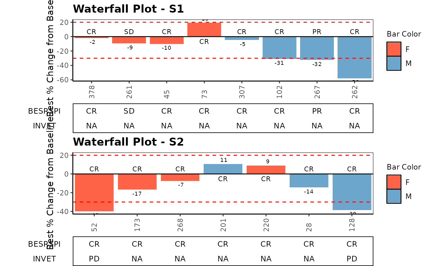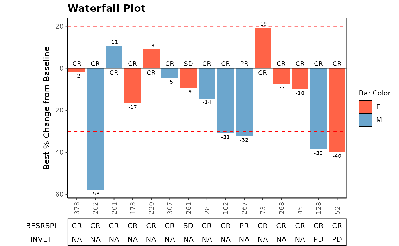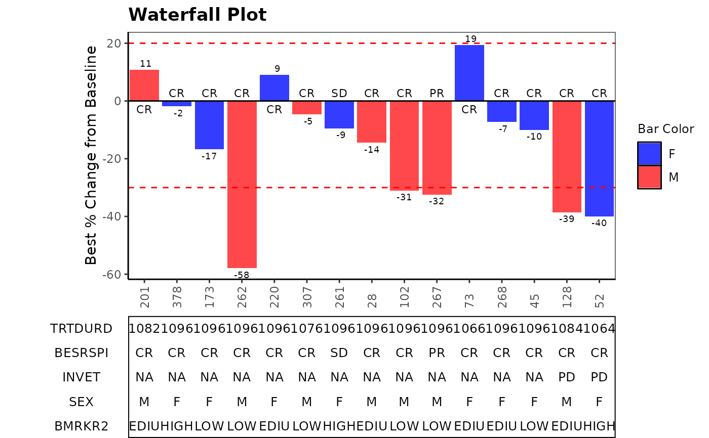 Waterfall plot is often used in Early Development (ED) to present each individual patient’s best response to a particular drug based on a parameter.