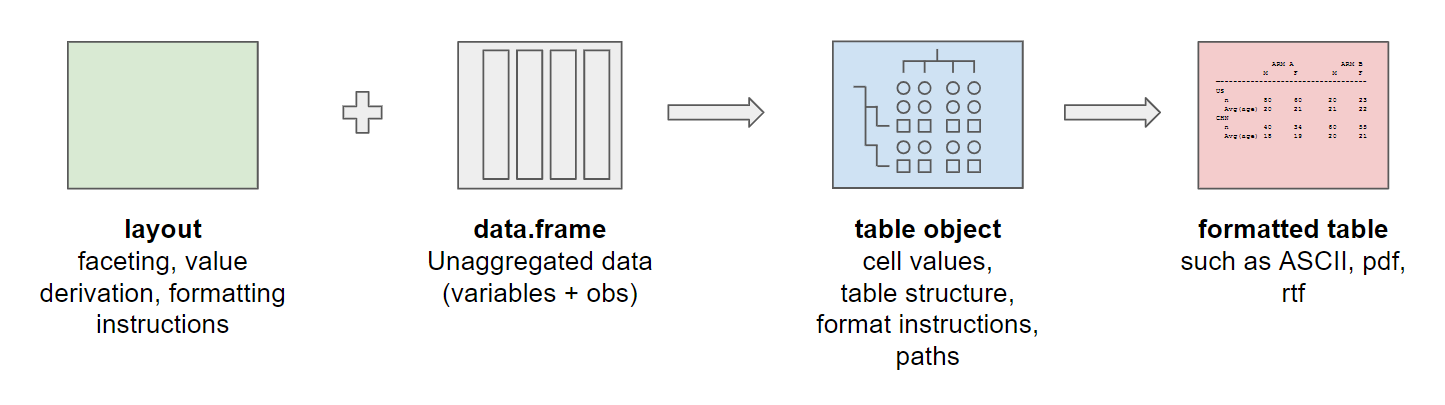 More in depth comparisons of the various tabulation frameworks can be found in the Overview of table R packages chapter of the Tables in Clinical Trials with R book compiled by the R Consortium Tables Working Group.