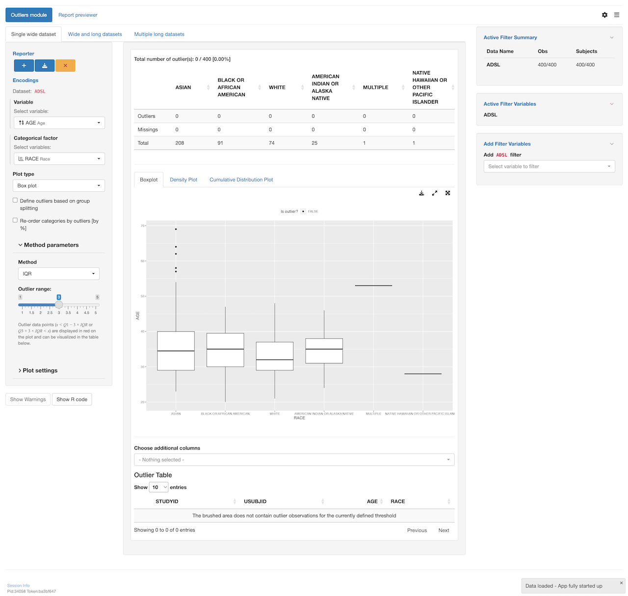 This vignette will guide you through the four parts to create a teal application using various types of datasets using the outliers module tm_outliers():