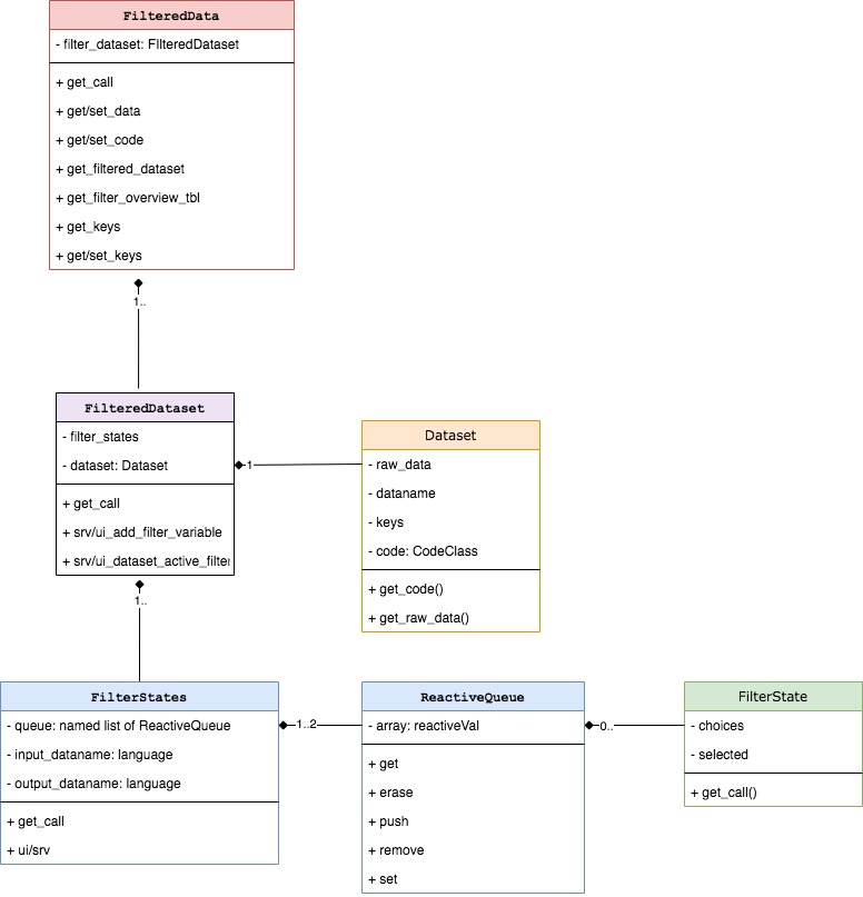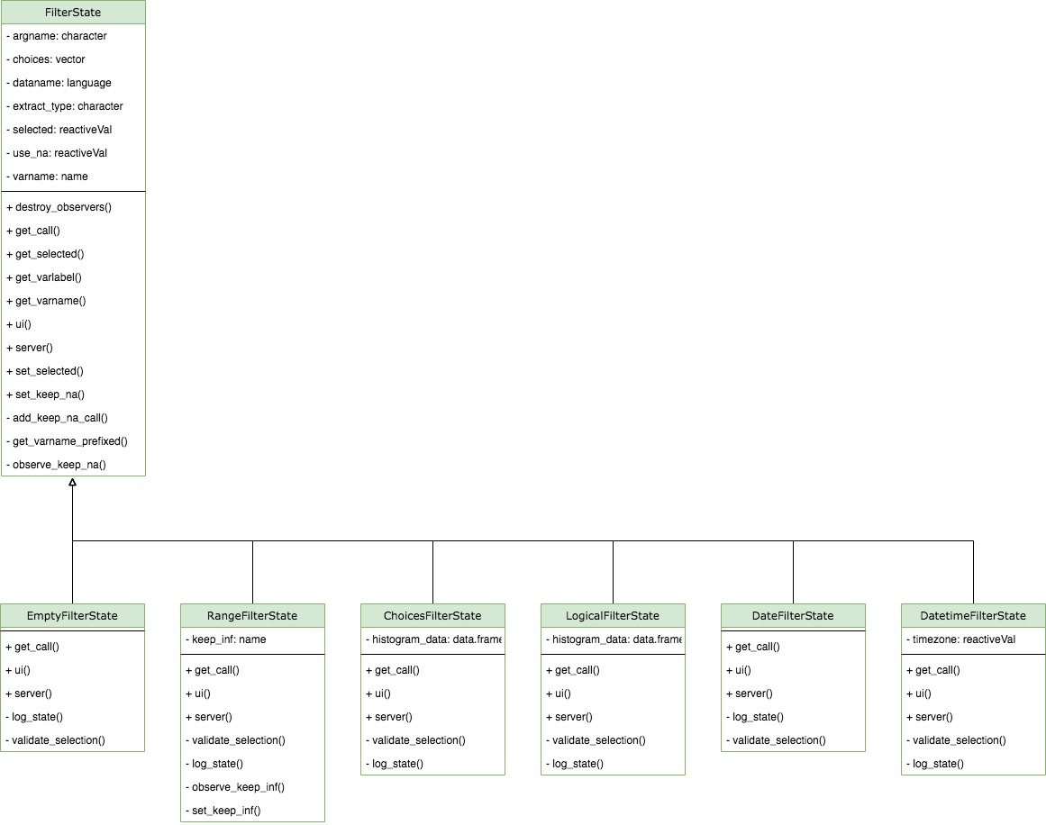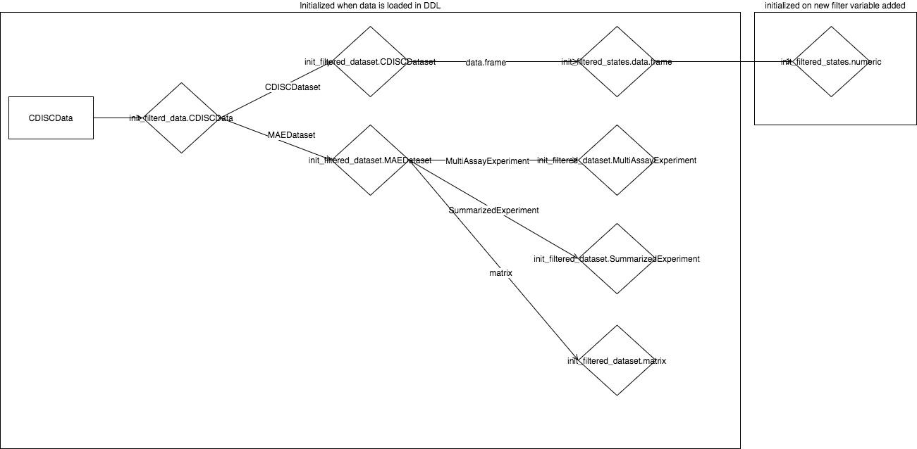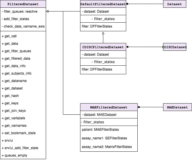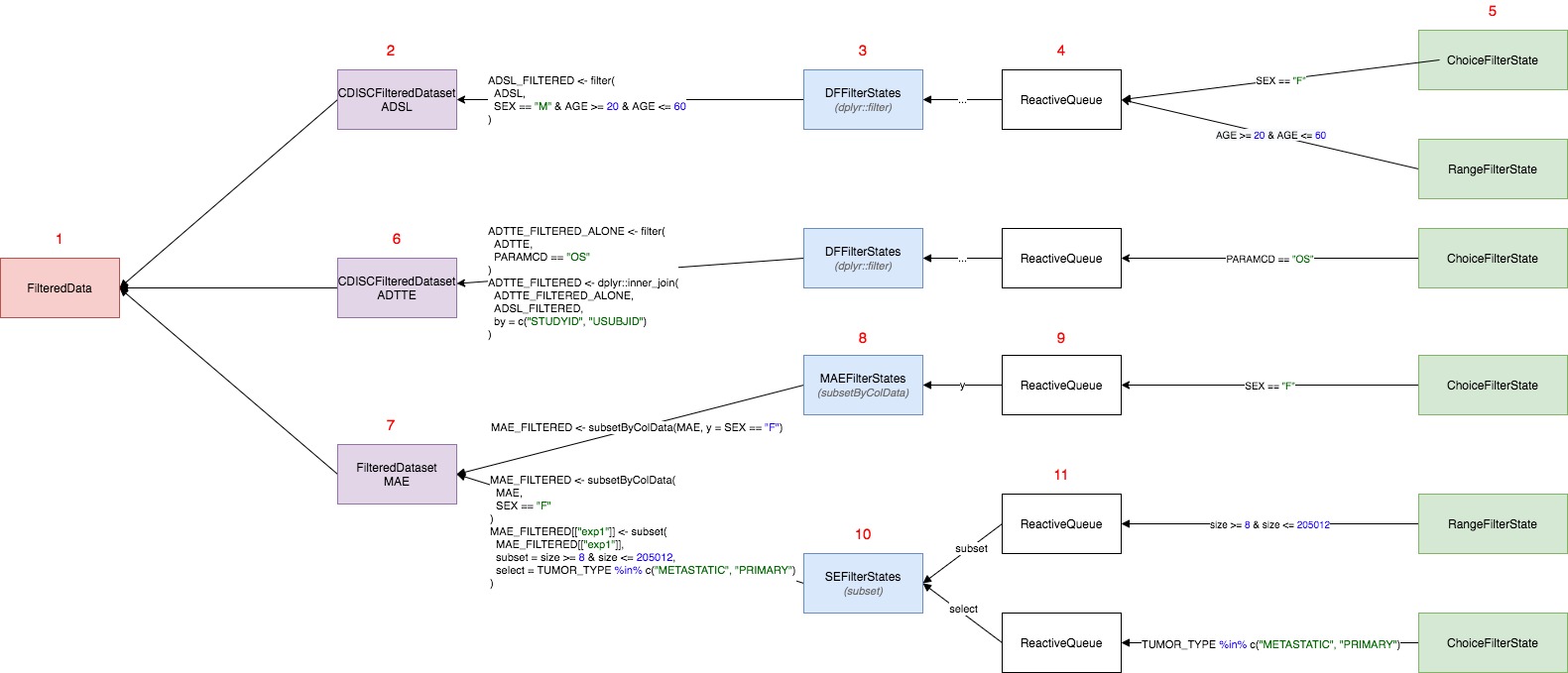 FilteredDatasetforADTTEworks the same way asADSLwith one difference.dplyr::filterforADTTEis followed by the merge call withFILTERED_ADSL- to be filtered by keys available parent.FilteredDatasetMAEis based onMAETealDatasetwhereraw_datacontains multiple objects which can be filtered on. In generalMultiAssayExperimentcontainscolData(MAE)which is aDataFramewith ADSL-like patient data.MAEcontains also multiple experiments which can be extracted usingMAE[["experiment name"]]and they can also be filtered in filter-panel. This means thatFilteredDatasetMAEhas multipleFilterStatesobjects: one for subjects data and one for each experiment.MAEFilterStatesobject is initialized for subjects data and for this objectSummarizedExperiment::subsetByColDatafunction is applied.SummarizedExperiment::subsetByColDatahas two argumentsx(data) andy(conditions).MAEFilterStatessimilar toDFFilterStateshas oneReactiveQueue(9) list foryargument in the function. Adding newFilterStatestriggers returning of the code similar to (4) and (5)SEFilterStatesis initialized per one experiment in the MAE data. This class is specific becauseSummarizedExperimentcontainscolDataandrowDatawhich correspond toselectandsubsetarguments insubset.SummarizedExperimentfunction. Similar tosubset.data.framesubsetrefers to the rows in the object, andselectrefers to the columns - but the call execution is little different because subsetting and selecting call refers to columns incolDataandrowData(objects attached to this experiment).
