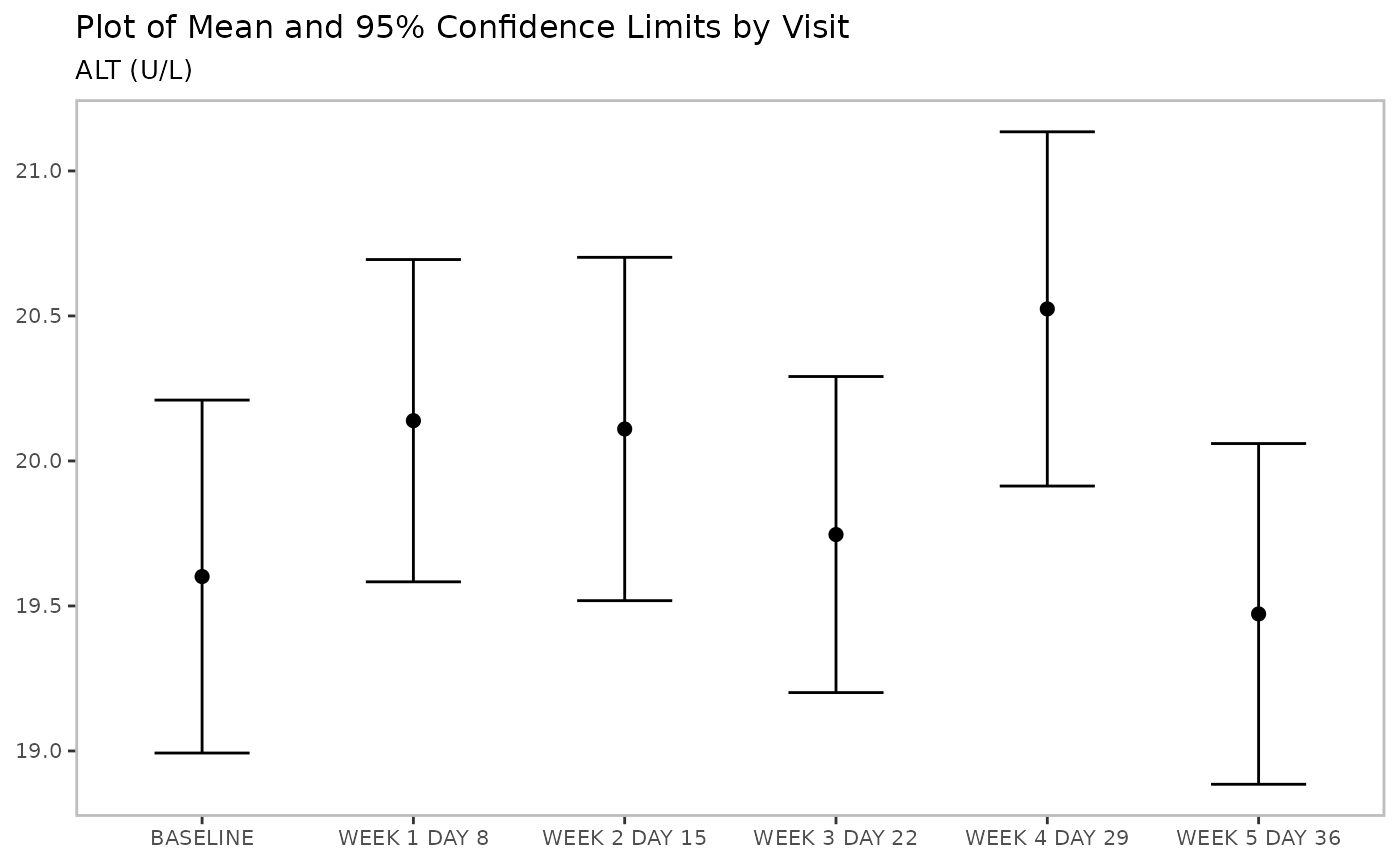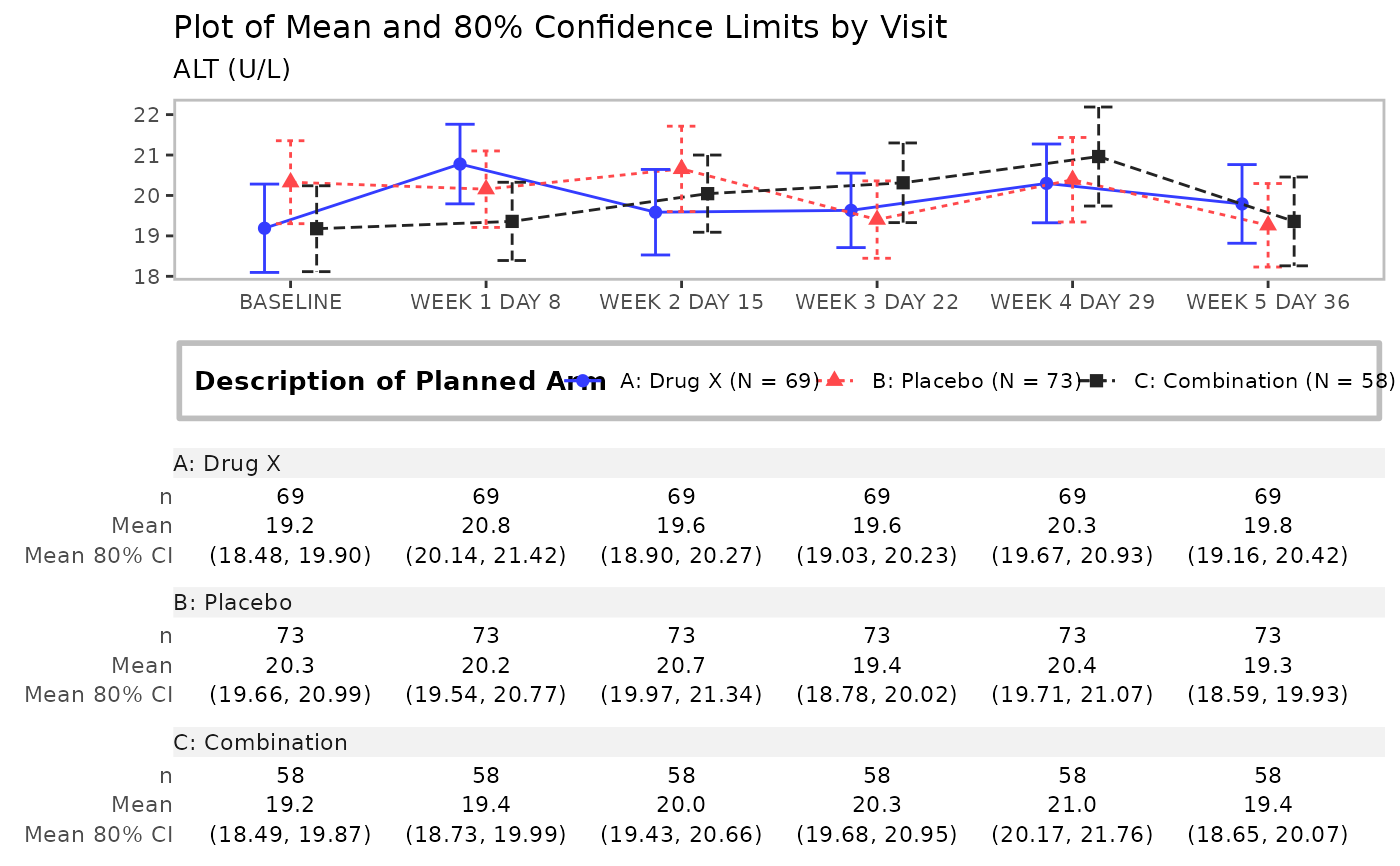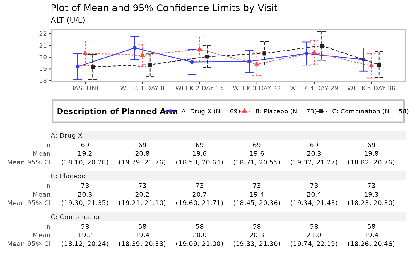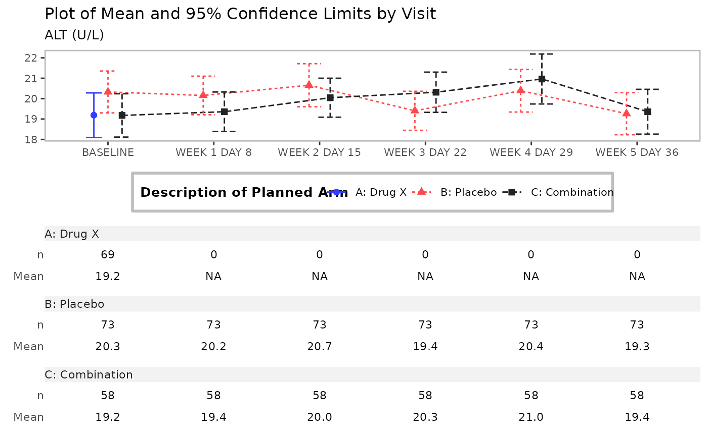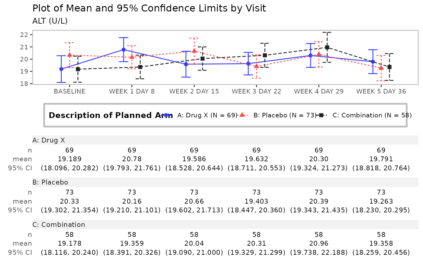 g_lineplot(adlb, adsl, table = c("n", "mean", "mean_ci"))
