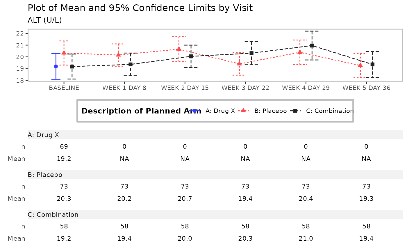g_lineplot(adlb, adsl, table = c("n", "mean", "mean_ci"))